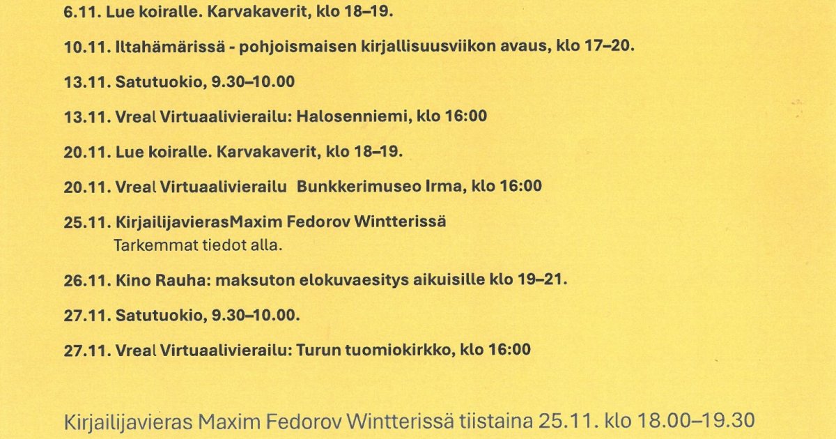 Näin tilaat tapahtumatiedotteen sähköpostiisi: lähetä pyyntö otsikolla "Tilaan kirjaston tapahtumatiedotteen" osoitteella lauri.seutu@uusikaupunki.fi.